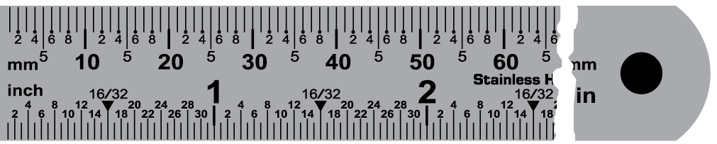 SS-01-150 Has both metric and inch graduations. Top edge is graduated in 1 mm increments with numbers/markings every 2 mm. Bottom edge is graduated in inches in 1/32nd increments with numbers/markings every 1/16th inch. SS-01-150 (6") features 180° angle in 5° increments on the back. Subsequent lengths have both angle lines in 5° increments and conversion tables on the reverse.