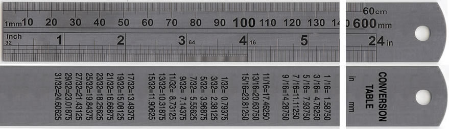SS-02-600 24" rulers have both metric and inch graduations plus a hang hole at the end of the ruler. Top edge is graduated in 1 mm increments with numbers in mm value. Bottom edge is graduated in inches. First two inches are in 1/32" increments, third inch is in 1/64" increments, the rest of the ruler is graduated in 1/16" increments. Rulers have conversion tables of inches and inch fractions to mm on the reverse.